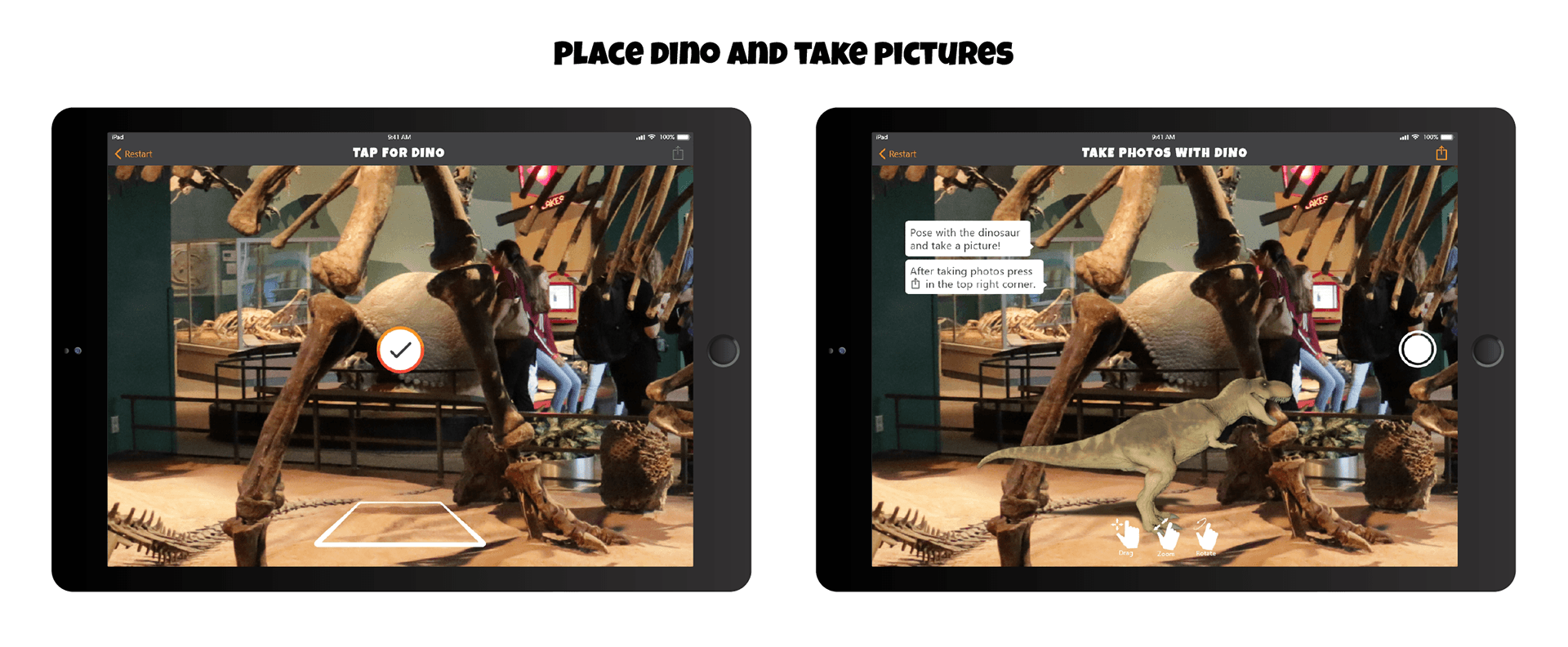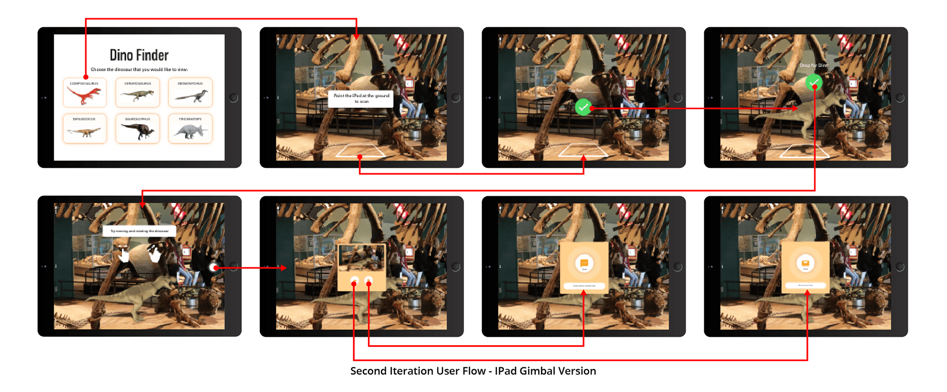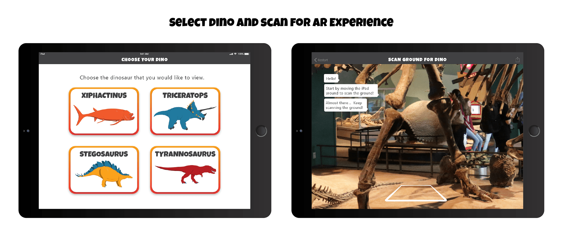 Visitors walk around the exhibit to see clearly marked custom dinosaur images that can be scanned on strategically placed IPads on mounted Gimbals.